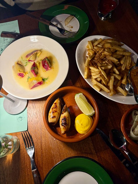 I don’t have much interest in doing deep reviews of dishes so early into an opening. That kind of restaurant take is also not really my thing. I will say that I was not surprised by how much I loved nearly everything that hit the table. The Sqimps, the most classically Sqirl-named dish on the menu, with stuffed shrimp chorizo in grilled squid and aioli over a fennel salad, is a knockout. The texture on the beef tartare is my favorite in a long time. A fermented shallot vinaigrette perfectly dressed a heaping bowl of California greens. They get fries right, a rarity in LA. But Sqirl doing great food is fairly table stakes to me, an earned level of trust in quality even for something brand new. I’m more intrigued by the direction Koslow has taken this place and how it’s landing in Los Angeles at this specific moment.