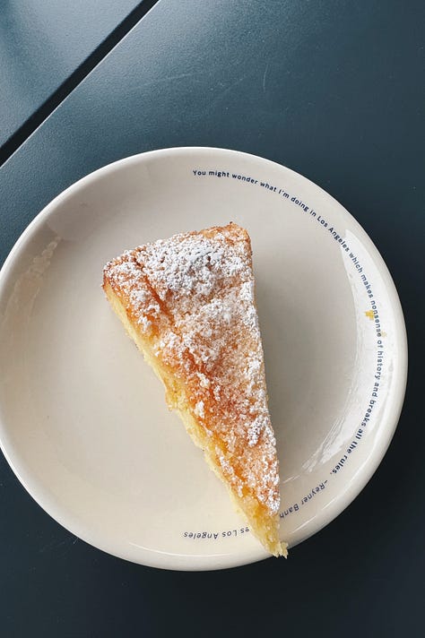 After dessert clears back on Virgil, the check arrives with a little candy on a classic Sqirl plate bearing a quote from local architect Reyner Banham: “You might wonder what I’m doing in Los Angeles which makes nonsense of history and breaks all the rules.”
