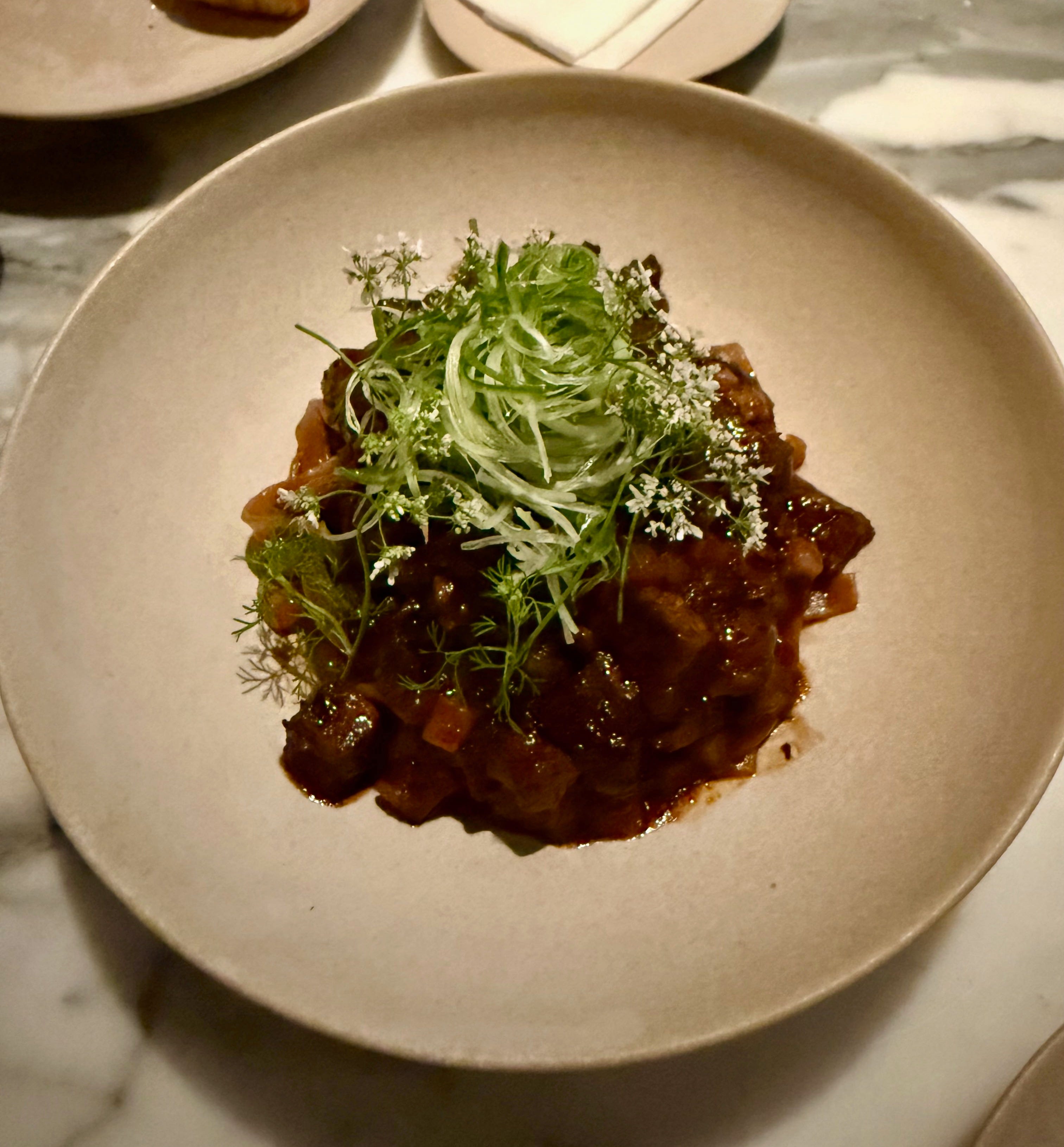Okay, I’m going to try to recall what I know about this dish. Jon Yao takes inspiration from the niu rou mian he grew up eating in the San Gabriel Valley, a Taiwanese beef noodle soup that screams comfort. He incorporates American wagyu beef cheek from a New Mexican cow that I’ve been assured is quite special. I don’t know. By the time this bowl arrives at the Kato bar, I’m at least three drinks deep and merely nodding along to the spiel. This dish inspires a “let me at it” sensation. They’re the country’s best version of takeout noodles, elevated by a singular Los Angeles talent.