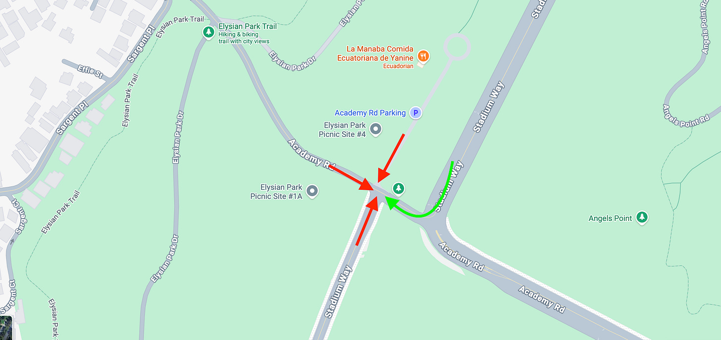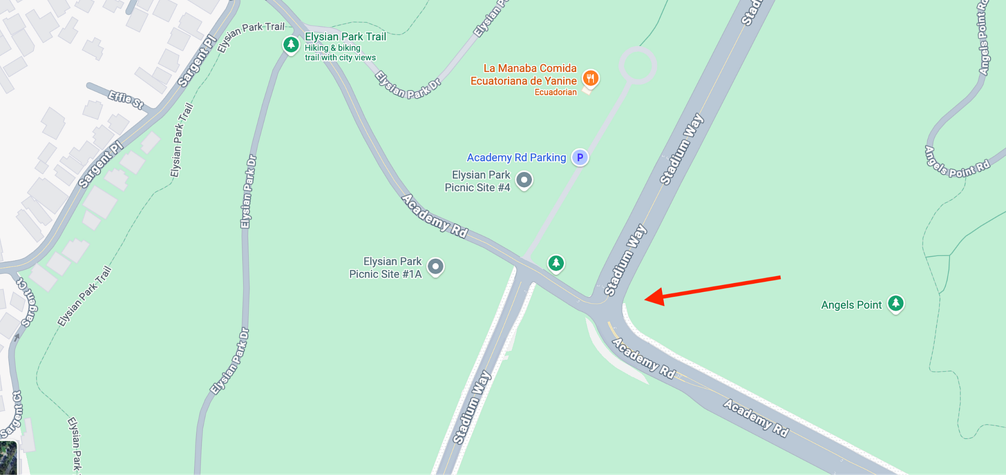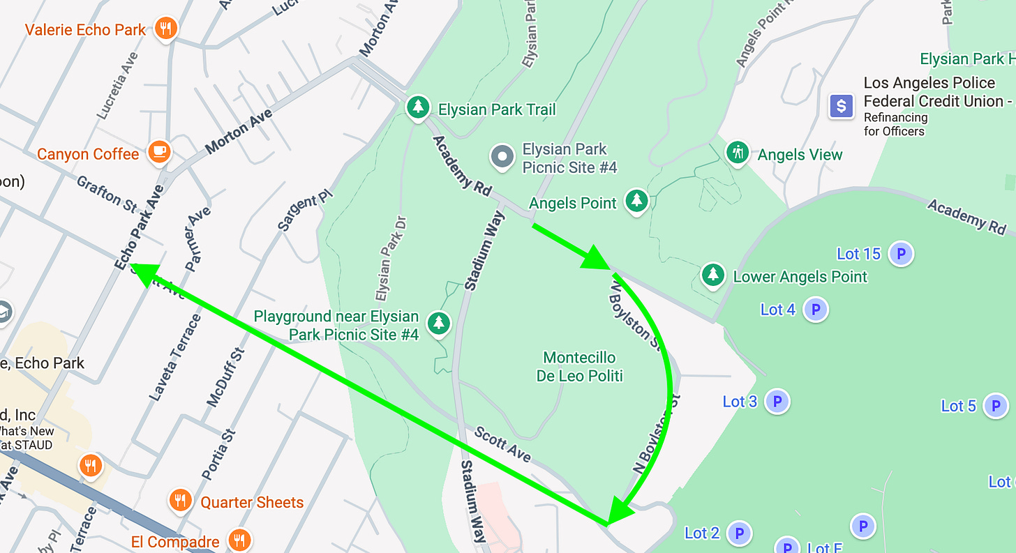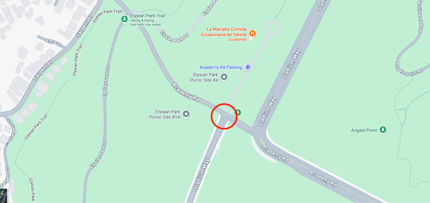 This is where Stadium Way meets Academy Road in Echo Park, sandwiching Dodger Stadium and Elysian Park. If you venture these streets with any frequency, you know exactly where this is headed. Few things disturb LA’s chill like bringing up the absurdity of navigating this space during both peak and random hours.