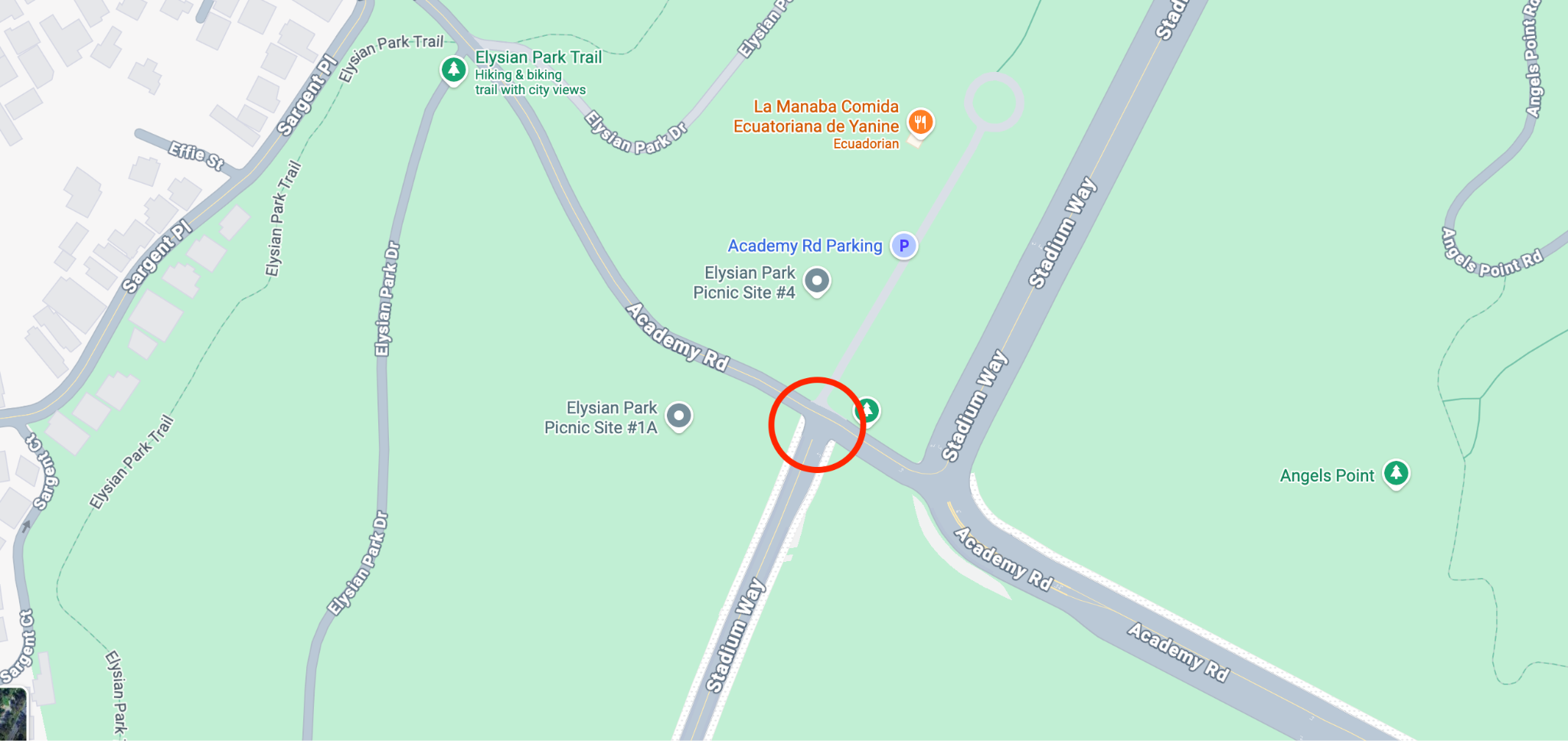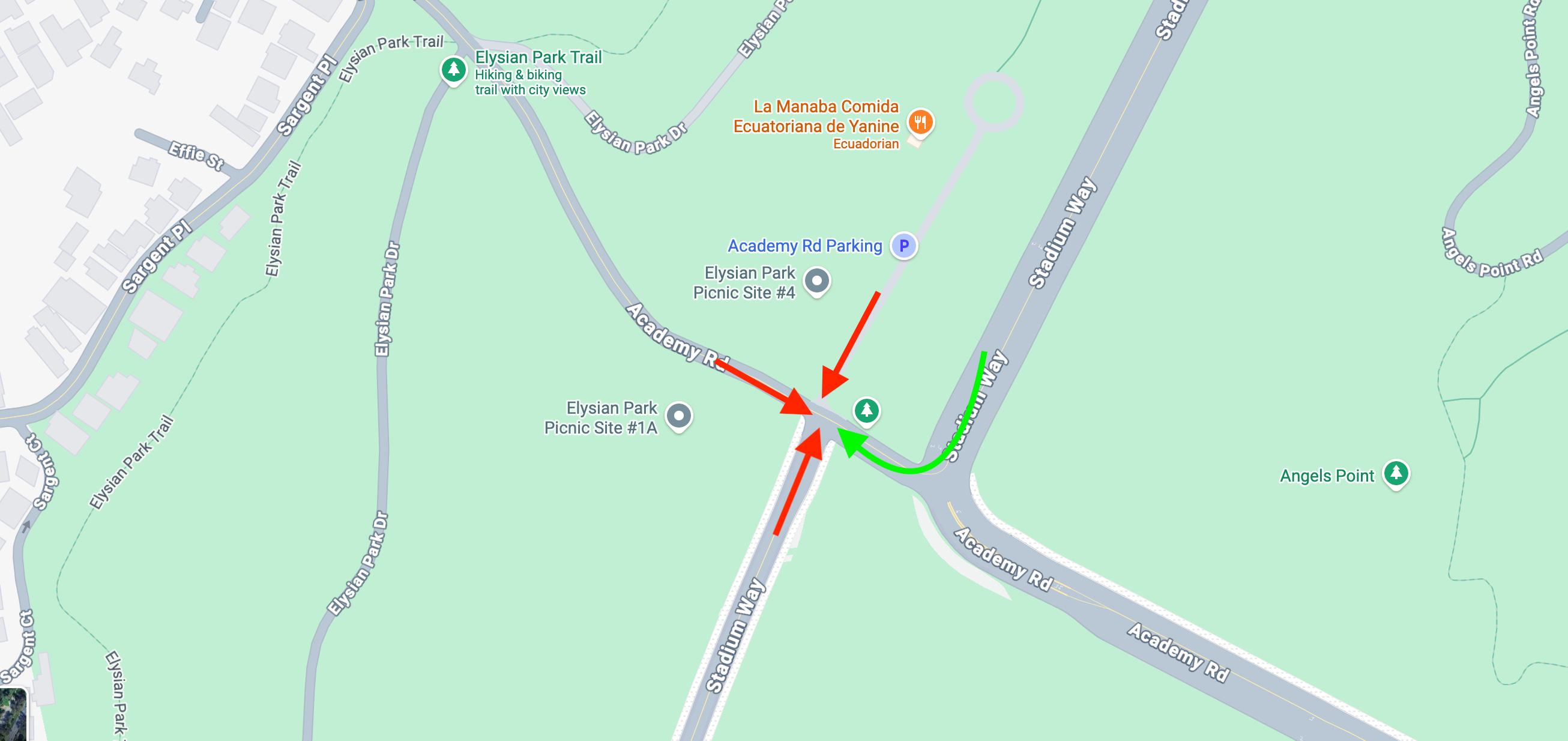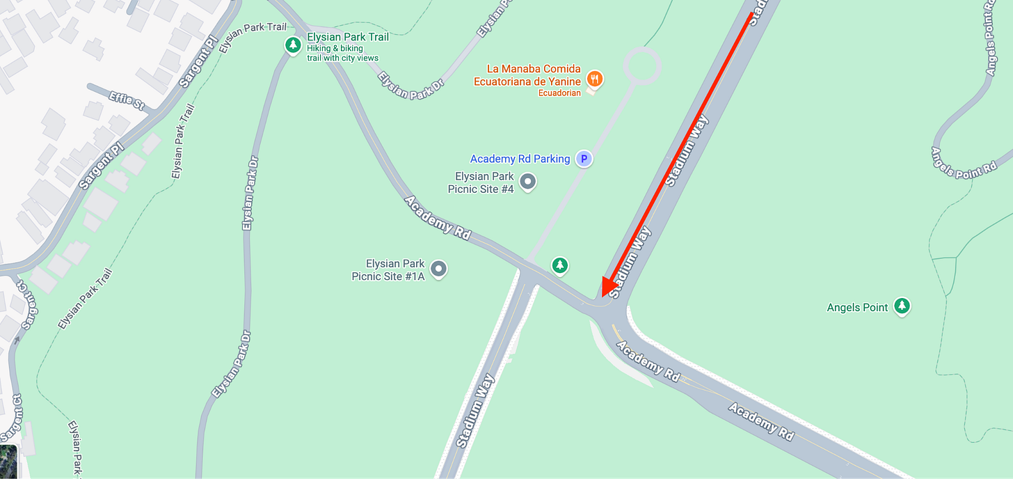 This is where Stadium Way meets Academy Road in Echo Park, sandwiching Dodger Stadium and Elysian Park. If you venture these streets with any frequency, you know exactly where this is headed. Few things disturb LA’s chill like bringing up the absurdity of navigating this space during both peak and random hours.