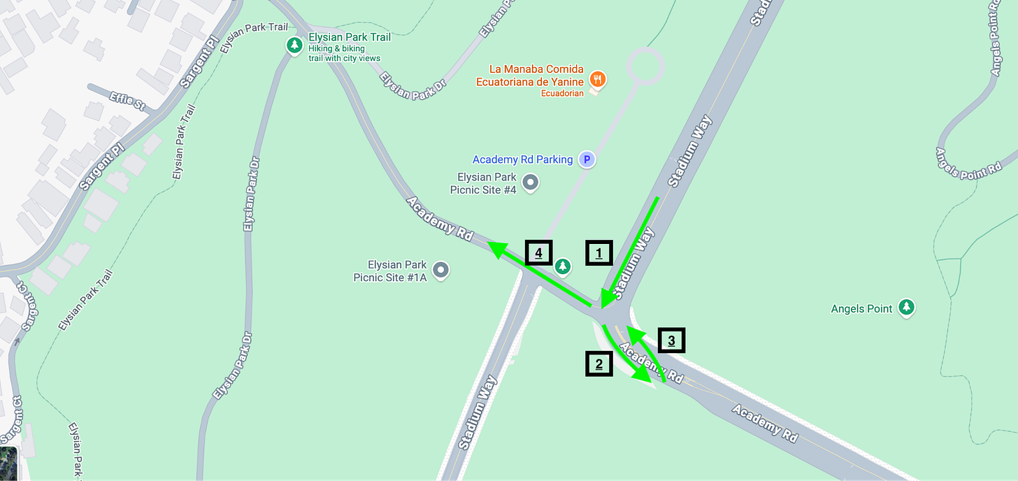 This intersection below where the arrows all meet is only a three-way stop. A southbound car on Stadium Way should theoretically be able to right turn down the ramp — maybe yielding to a westbound car on Academy that just hit a stop sign, the only reason for any slowdown — and continue on unabated.